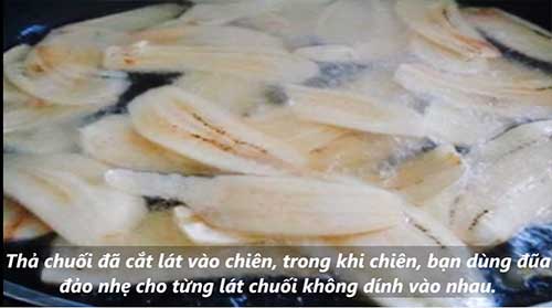 Chuối sau khi ướp đổ ra thau cho giáo nước sau đó đưa vào chảo chiên giòn. Chiên cho chuối chín vàng sau đó để ra khay cho chuối nguội rồi bỏ chuối vào tủ sấy hoặc máy sấy thực phẩm sấy cho khô dầu. Nhiệt độ sấy khoảng 60 độ C thời gian tùy vào sản phẩm bạn mong muốn.