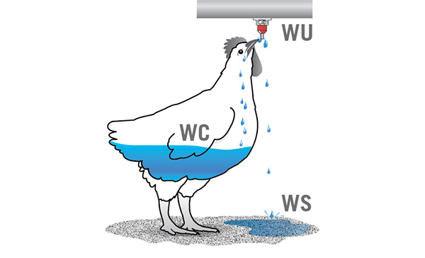 Lượng nước đã sử dụng (WU) chính là tổng lượng nước đổ vào hệ thống cấp nước như máng uống hay đường ống của cơ sở chăn nuôi gia cầm đó. Nước trong hệ thống cấp nước có thể rơi vào 2 trường hợp. Một là sau khi gia cầm uống, nước đó đi vào cơ thể gia cầm và được gọi là lượng nước đã được hấp thu (WC). Đồng thời với đó là một lượng nước nhất định bị đổ ra ngoài, không được tiêu thụ bởi gia cầm (WS).