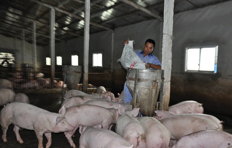 Ông Hoàng Văn Điền đổ cám cho đàn lợn ăn tại trang trại của gia đình ở huyện Yên Mô (Ninh Bình).